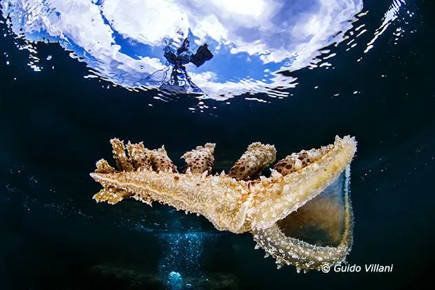 А чтобы добыча не успела улизнуть, края ротового «капюшона» снабжены щупальцами. Они помогают заталкивать брыкающуюся жертву в пасть. А ещё работают как сенсоры. Если маленькая любопытная креветка заденет один из выростов, то рот тут же захлопнется, как капкан.