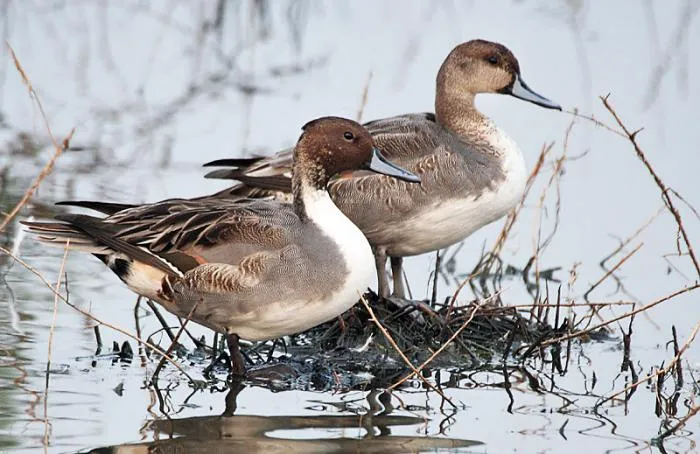 У некоторых птиц всё не так радикально. Например, утка-шилохвость. Сверху — самец, который не полностью перелинял. Снизу — самец, у которого брачное оперение почти полностью оформлено.