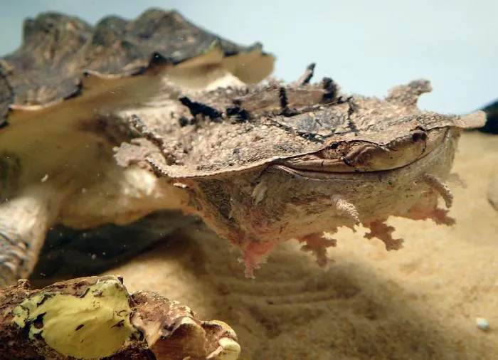Мата-мата относится к семейству змеиношеих черепах. Они не прячут голову в панцирь, а складывают её к одной из ног.