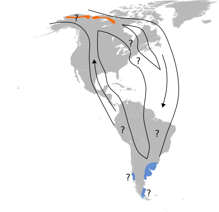Полный маршрут птиц. Но летали пернатые не только по Америке. В былые времена эскимосские кроншнепы изредка залетали и на территорию Западной Европы, в том числе в Испанию, Шотландию и Англию. Бывали они и в России, на Чукотке.