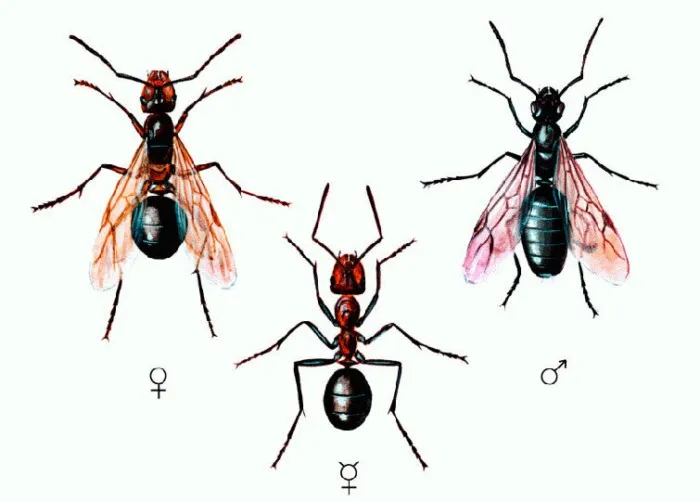 Рыжие лесные муравьи слева направо: самка, рабочая особь, самец.