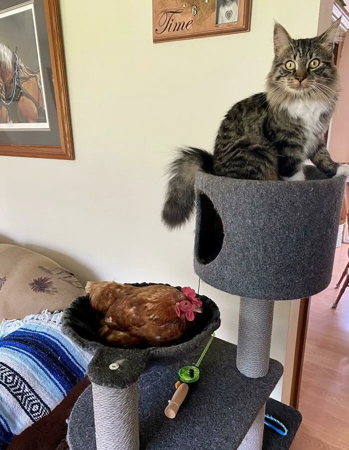 18. "Наша новая кошка из приюта прекрасно уживается с курицей"