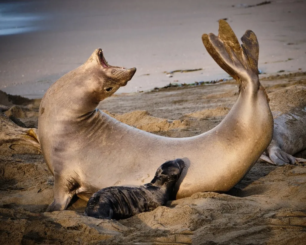 Можно подумать, что так самцы привлекают самок. Но нет. Мужикам всё равно, что там думает слабый пол: дамы в 3 раза мельче своих ухажёров и не имеют права даже пикнуть. Победивший самец автоматически захватит берег и всех самок, что выйдут на него. Дамы прибывают ненадолго — всего на полтора месяца. На земле они также сидят впроголодь, истощая личные жировые запасы. Поэтому самки стараются успеть за это время родить, выкормить детёныша и спариться, чтобы потом на долгие месяцы вновь уйти в море.