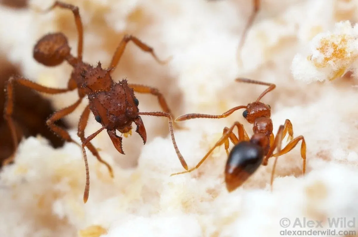 Справа – муравей мегаломирмекс, он паразитирует на муравьях-листорезах. И те не могут его остановить, ведь у малыша есть ядовитое жало.