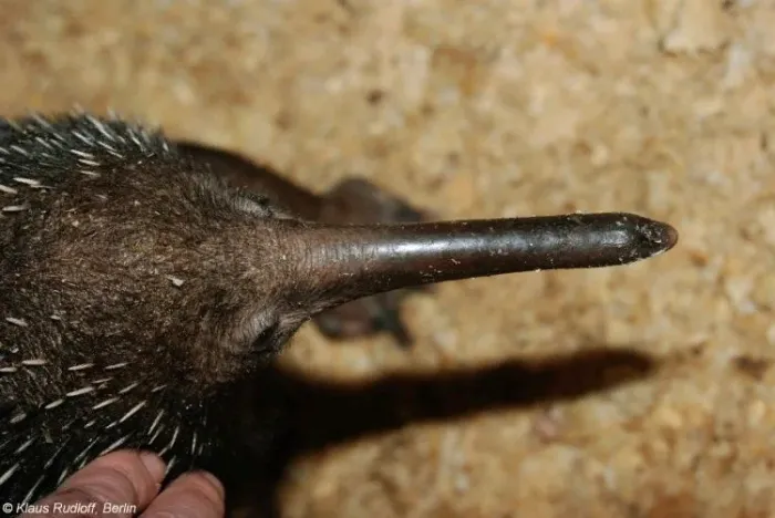 Ну ладно, про отсутствие иголок загнул, но они у проехидны Брюйна гораздо короче и мало напоминают опасный частокол игл. Зато мордаху зверюга отрастила намного длиннее. Так называемый рострум занимает почти две третьих таблоида и изгибается вниз. Зубов такой конструкт не предусматривает, поэтому зверю приходится активно работать языком.