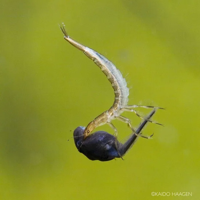 Далее уже воля Судьбы. В зависимости от температуры воды и конкретного вида личинки плавунцов могут вылупиться через 8 дней, а могут и через 40. Своим внешним видом детки заткнут за пояс монстров из фильмов ужасов и ведут себя соответствующе. Они ещё более прожорливы и агрессивны, но менее проворны. Так что добычу плавунцовая молодёжь не преследует, а ожидает в засаде. Насекомое садится на ближайший куст и выставляет свою попу над поверхностью воды. Так оно обеспечивает себя кислородом через дыхальца на брюшке.