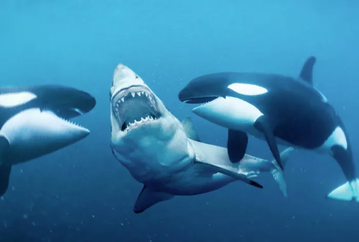 Косатка - представитель семейства дельфиновых. Эта особь не просто защищается от акулы. Она охотится на неё! Оба противника находятся в одинаковых весовых категориях и обладают равным вооружением. Преимуществом дельфина снова становится интеллект.