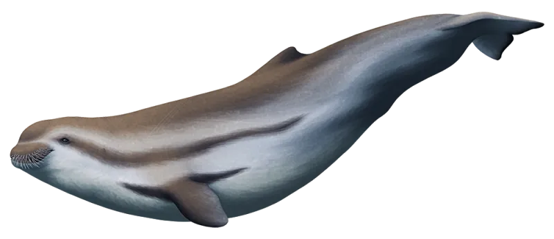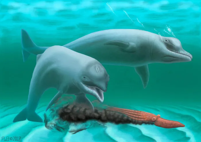 Карликовый беззубый дельфин тоже относился к планктоноедоедам и возник 29 миллионов годков тому назад. Он стал весьма специализированным хищником, который охотился только на придонную рыбу, кальмаров и небольших беспозвоночных. Добыча эта беззащитная, но с подвохом. Животины обожают прижиматься к песку или зарываться в него, покусать их очень проблематично. Поэтому наши герои и отказались от зубов. Всасывать добычу оказалось проще.