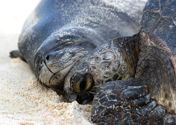 Черепаха и тюлень-монах мирно спят друг с другом.