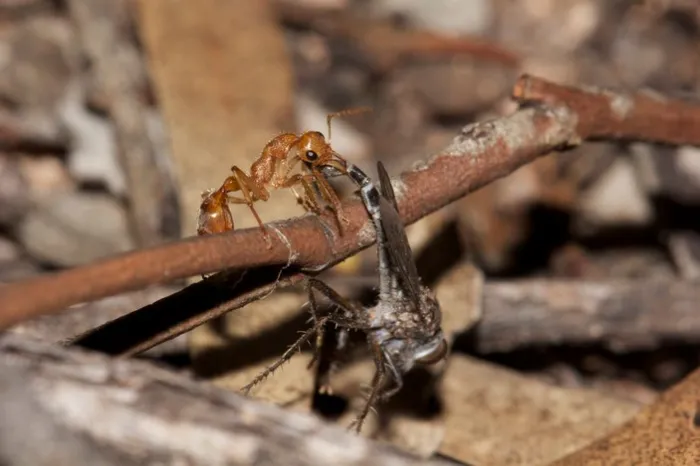 Каждую ночь и стар и млад покидают общий дом и отправляются на поиски пищи. Ночи в Южной Австралии холодные, температура может опускаться до 8 градусов, и многие насекомые впадают в оцепенение. Чем муравьи и пользуются. Благодаря развитым глазам они издали обнаруживают жертву и получают тактическое преимущество. В большинстве случаев добыча погибает до того, как успеет оказать сопротивление. А даже если успеет, то ей вряд ли это поможет. Динозавровый муравей вколет ей несколько доз токсичных алкалоидов.