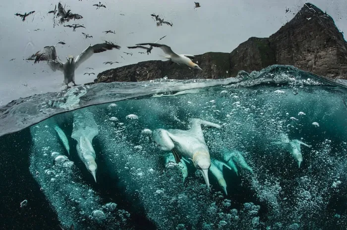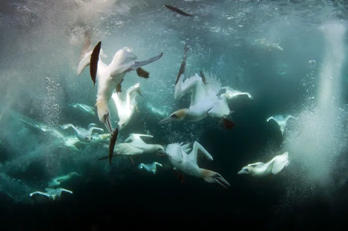 И вот, когда добыча обнаружена, пернатые стремглав бросаются вниз! Крылья прижаты, всё тело вытянуто и напряжено: олуши становятся похожи на стрелу, пронзающую водную гладь. Скорость такого пикирования может достигать 100 км/час! Как после такого столкновения пернатые вообще остаются живы?