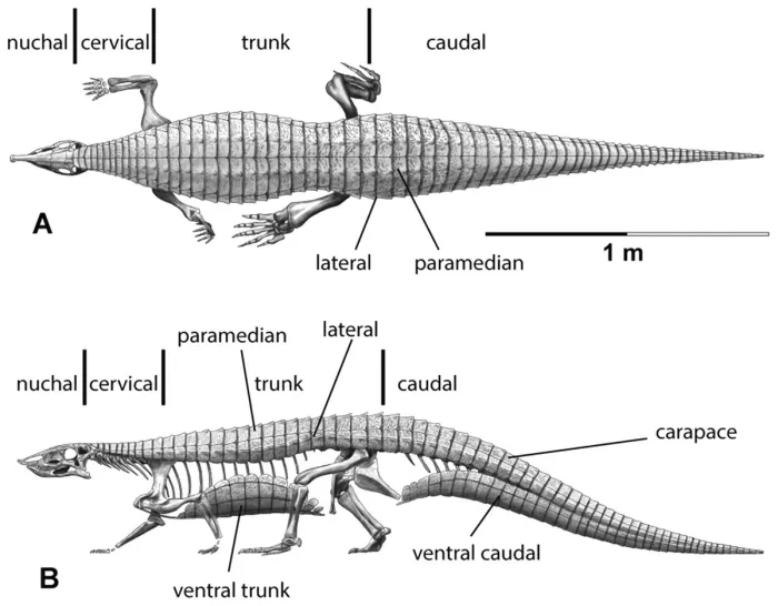В длину стагонолепис достигал 3 метров — в эпоху зарождения гигантских динозавров такие размеры не внушали страха. Чтобы выжить, медлительному и неповоротливому этозаврию пришлось приодеться в бронежилет, который защитит от любых когтей и зубов. На спине и брюхе стагонолеписа располагались сплошные щиты из остеодерм — подкожных костных пластинок. Рядов было настолько много, что конструкция тянулась от затылка и до самого кончика хвоста!