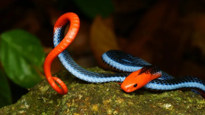 Правда, этого хитрого негодяя едва ли можно назвать замаскированным. Ярко-красная голова и хвост, небесно-голубой животик и черная спина — аспид всем своим видом показывает, что он никого не боится. Наоборот — это другим нужно его бояться. К тому же бояться есть чего: габариты у змеи не маленькие — два метра! До питона далеко, но и крохотным шнурком такую рептилию не назовешь.