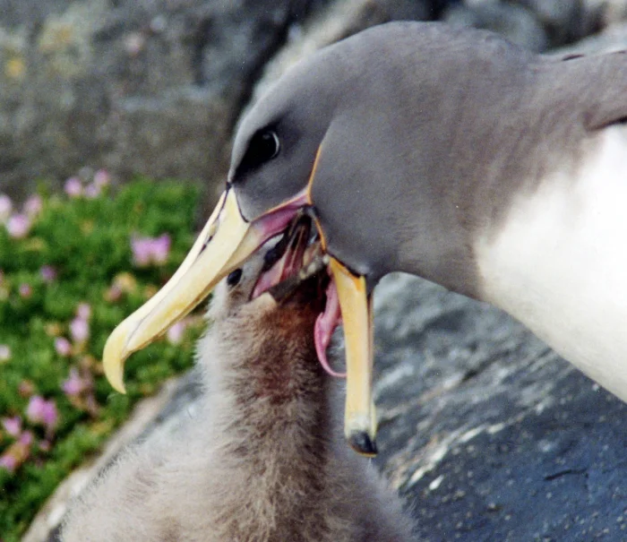 Но птенцу некогда задумываться о своём положении. Он постоянно ест! Родители старательно и непрерывно набивают малыша пищей. Причём не рыбкой, которой питаются сами. Его кормят жижей, состоящий из воскоподобных веществ, липидов и крайне вонючих триглициридов. Вонючих настолько, что меткими плевками этой жидкости альбатросы отгоняют от себя хищников. А малыш ничего, терпит. И растёт как на дрожжах.