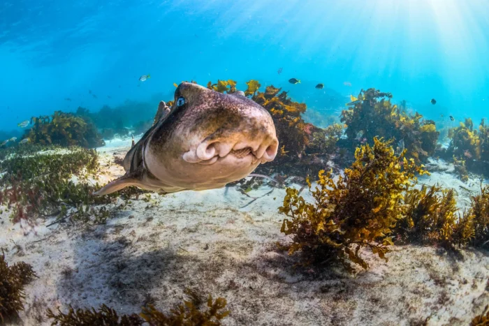 Австралийская бычья, рогатая, или акула Порт-Джексона — гротескная хрящевая рыбина из рода рогатых акул. Самая крупная среди остальных девяти видов, между прочим! Самки вырастают до 165 сантиметров в длину, самцы — чуть поменьше. На мегалодона, конечно, не тянет, но зато у доисторического гиганта не было таких наворотов, как у нашей героини!