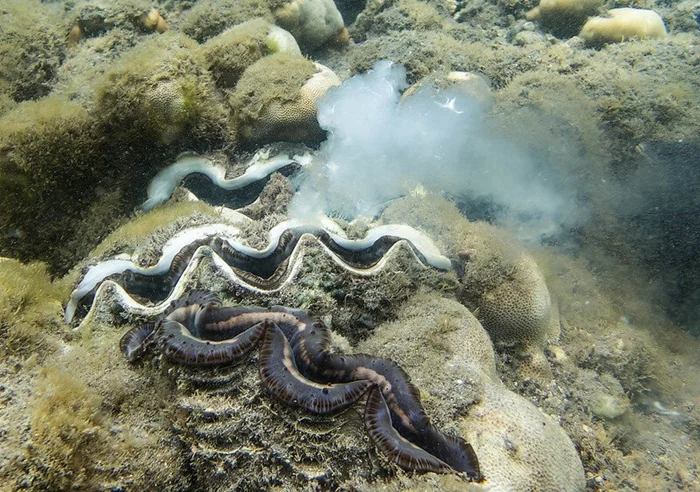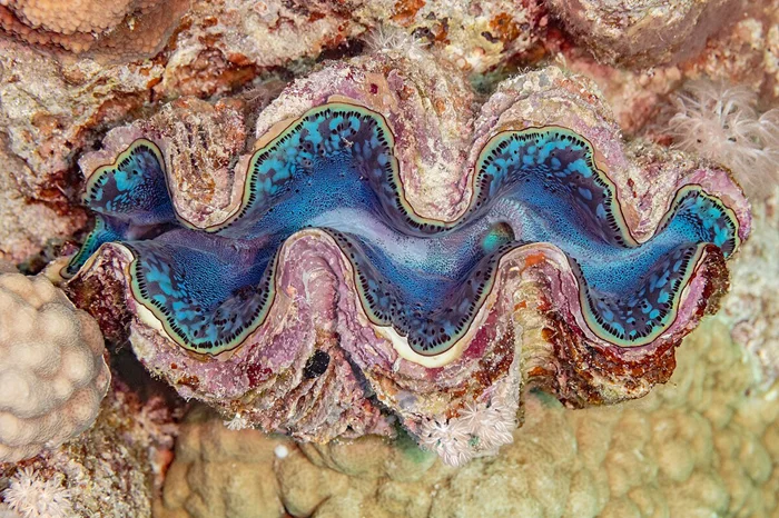 Из-за связи с водорослями цвет мантии тридакны становится ярко-голубым.