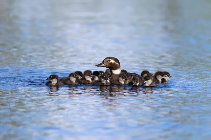 Благо, что потомство будущей мамочки самостоятельно с самого рождения. Уже спустя несколько часов после вылупления пуховые комочки готовы шагать за родительницей и постигать основы морянской жизни. Первое время в открытое плавание утят никто не выпустит. Осваивать азы они будут на озере, повторяя за самкой. Но иногда тяга к морю перевешивает родительские инстинкты, и мамочки идут на хитрость: спихивают подросших птенчиков на «плечи» другой самки. И тогда одна аулейка плавает в толпе из разновозрастных утят. А «кукушка», освободив себя от хлопот, скорее улетает покорять открытые воды. Спустя полтора месяца птенцы и сами сменят пуховой наряд на взрослый и разлетятся кто куда.