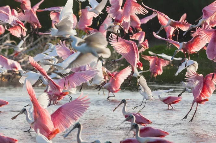 И при этом далеко не все птицы подходили для плюмажей. Дело в том, что розовые колпицы не умеют вырабатывать красные пигменты. Они получают его вместе с едой — пресно- и солоноводными рачками. Чтобы выудить такую мелочь из водоёма, птички превратили свой клюв в подобие ложки. Животные набирают в него воду, после чего профильтровывают её и съедают органический остаток.