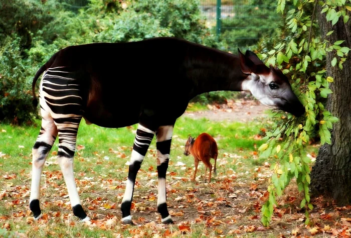 Черно-белые полосы на шкуре задних ног – это отличная защитная маскировка. В отличие от жирафов, которые в основном обитают на открытых местах, в саванне, окапи прячутся в густой заросли тропиков, где они становятся незаметны на фоне теней и солнечных лучей, проникающих сквозь листву.