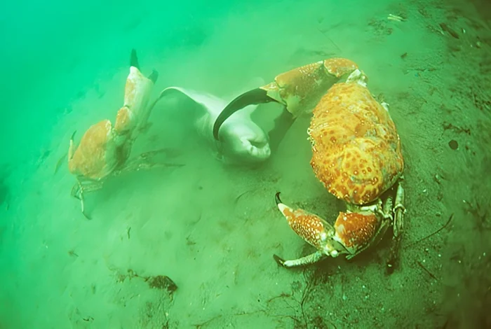 А вот на мелководье полно живности, и эта живность периодически умирает. Стоит бренному телу опуститься на дно, на горизонте уже маячит рельефный панцирь тасманийского краба. Кроме мертвечины, огромный краб может похрустеть такими же нерасторопными обитателями дна — моллюсками, морскими звездами и крабами поменьше. Даже своих собратьев он не пожалеет. Еда — это всё, что меньше и слабее тебя.
