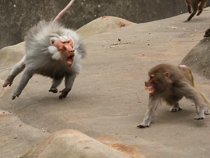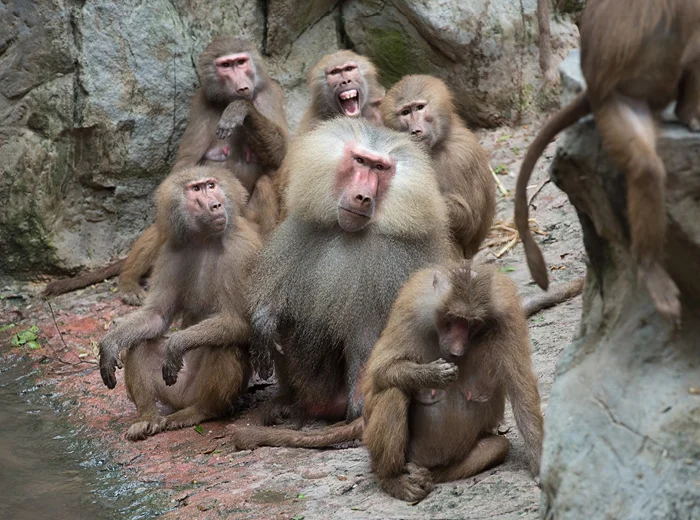 С такими вводными определение лидеров производится быстро и честно: с помощью безжалостного боя, крепких подзатыльников и прокушенных боков. Те гамадрилы, что оказались способны постоять за себя, попадают на высшую ступеньку «общества» и обзаводятся гаремом из нескольких самок. Так появляется клан из нескольких десятков особей.