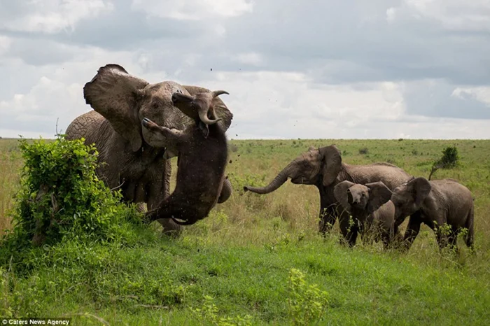 Обычно схватка разъярённого слона и разъярённого буйвола происходит вот так. Как видите, даже у крупного бычка мало шансов устоять перед несколькими тоннами мощи.