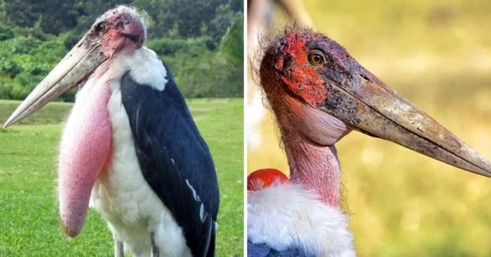 Гордый хищник марабу легко сможет напугать любого человека своим внезапным появлением. Эти птицы имеют довольно крупные размеры (около 9 килограммов) и не самый добродушный вид. Чего стоят только огромный и толстый клюв марабу и его жуткий горловой мешок.