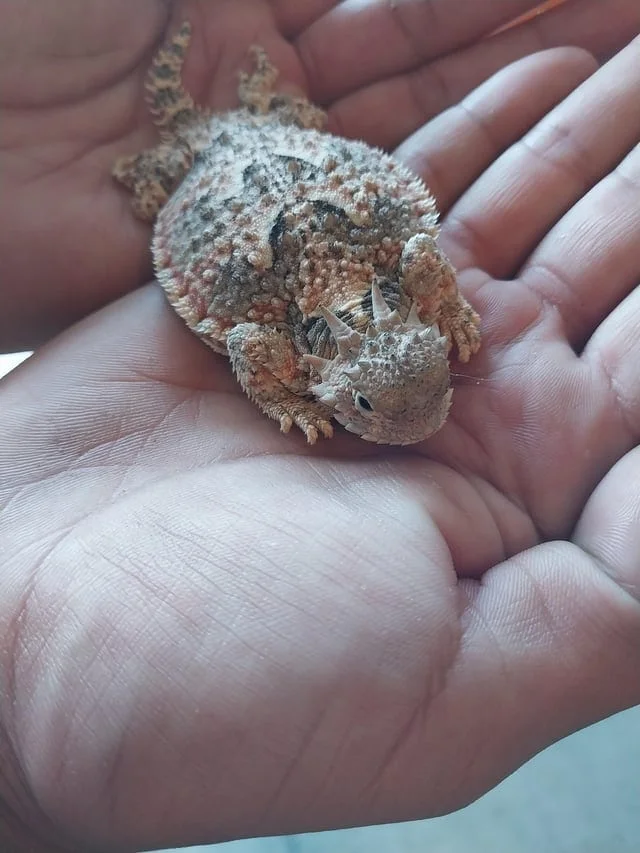 Это солнечная рогатая ящерица. Кстати, если она сильно напугана, то может стрелять кровью из уголков глаз.