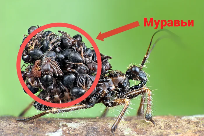 Зачем же этот маньячилла собирает целый некрополь? Неужели готовится к восхождению в личи? А ведь почти так оно и есть. На первых порах, когда тел на спине ещё мало, запах павших муравьев маскирует клопа-хищнеца. Так у него получается ещё более эффективно охотиться, ведь пробегающие мимо муравьишки думают, что тут знакомый запах братишек, а значит – безопасно.