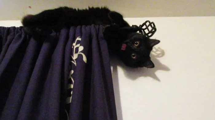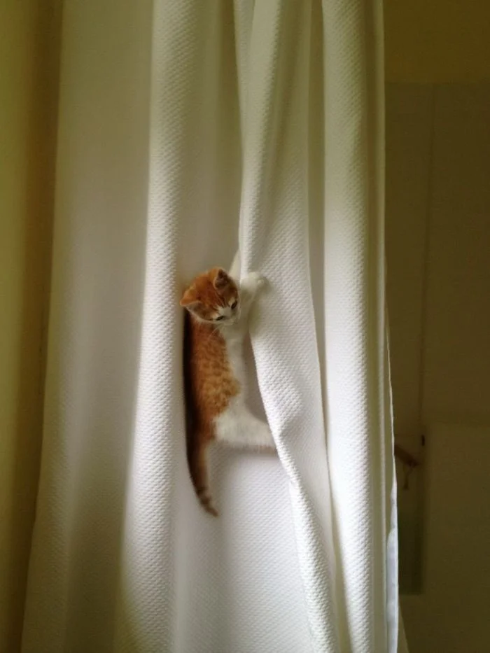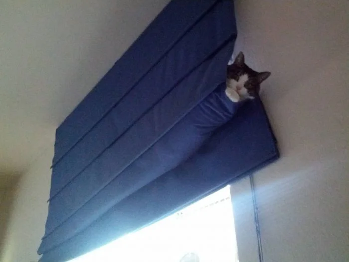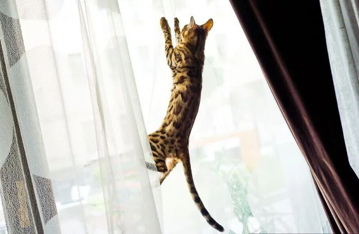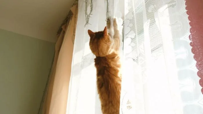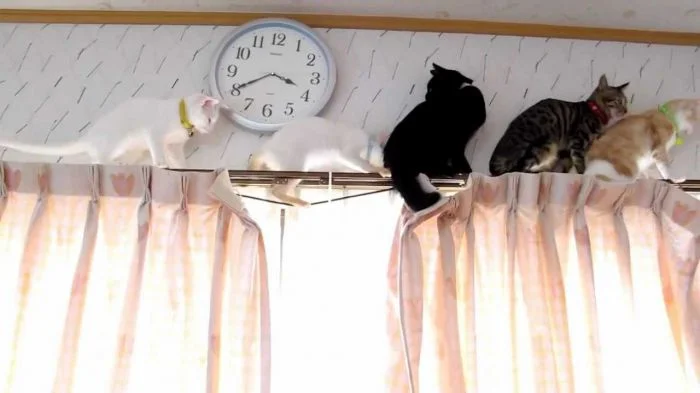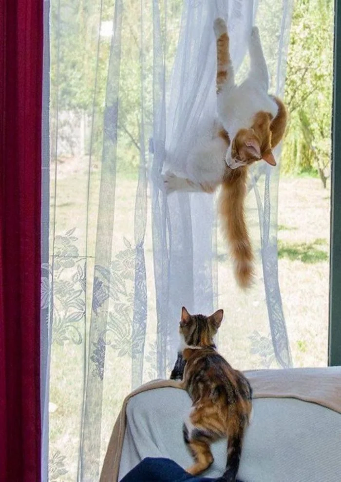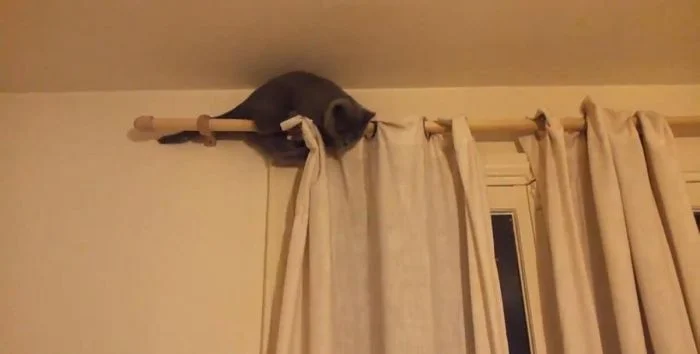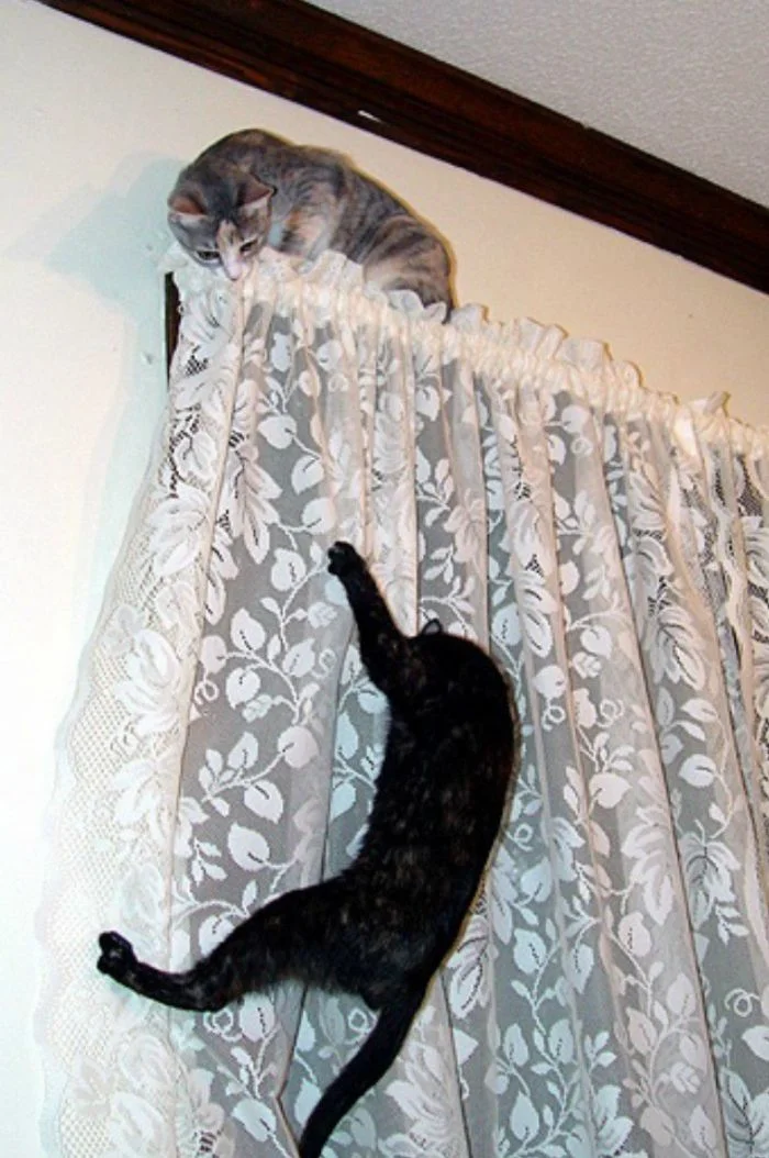 Но не только этими функциями славны декоративные занавеси. По ним можно лазить, на них можно кататься, меняя вид и эстетические характеристики. С этим на ура справляются хвостатые акробаты-дизайнеры, которые знают толк в быстром, ловком и креативном декорировании штор.