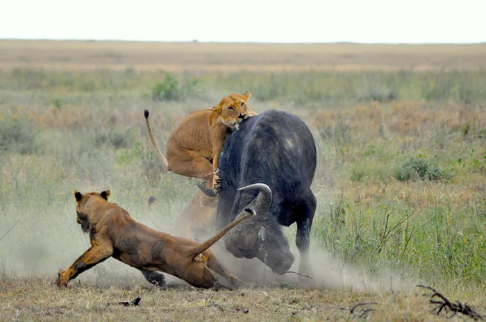Мало того, что лев — крупнейший наземный хищник Африки, так он ещё и работает сообща! И это второй козырь в лапе большой кошки. Благодаря этому пушистые правители саванн способны завалить жертву, на которую другие охотники даже не зарятся. Только прайд может одолеть взрослого буйвола, бегемота, жирафа и даже молодого слона.