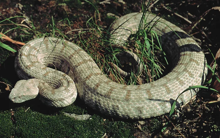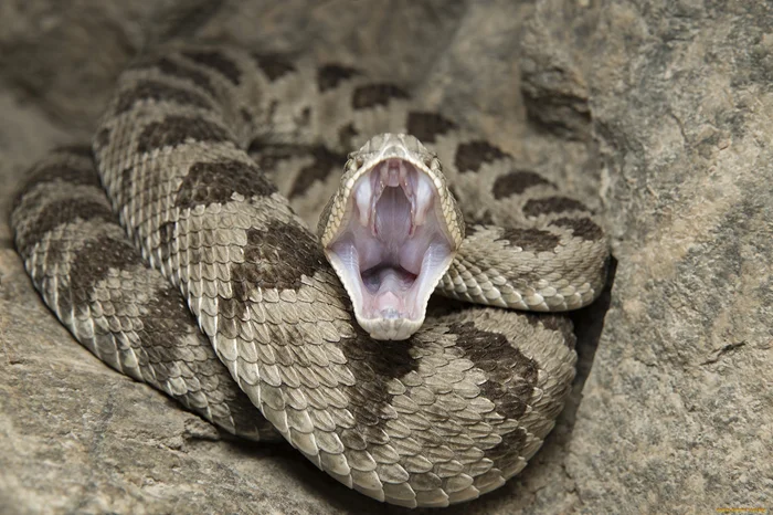 Гюрза, левантская, или тупоносая гадюка, — злобная и бесстрашная фурия, с которой лучше бы никогда не встречаться. Потому что вас она сразу покусает, и ничего ей не будет. А вам её обижать нельзя — почти по всему своему ареалу эти рептилии находятся в списках исчезающих видов. Сегодня найти эту грымзу можно в степях, пустынях и полупустынях практически по всей Азии, в Северо-Западной Африке, в Индии и Пакистане, на островах Средиземного моря. У нас же примерно 7 тысяч ядовитых особей прописано в Дагестане. От всех остальных змей России её отличает три вещи: отличная маскировка, скверный характер и очень сильный яд. Убийственное комбо!