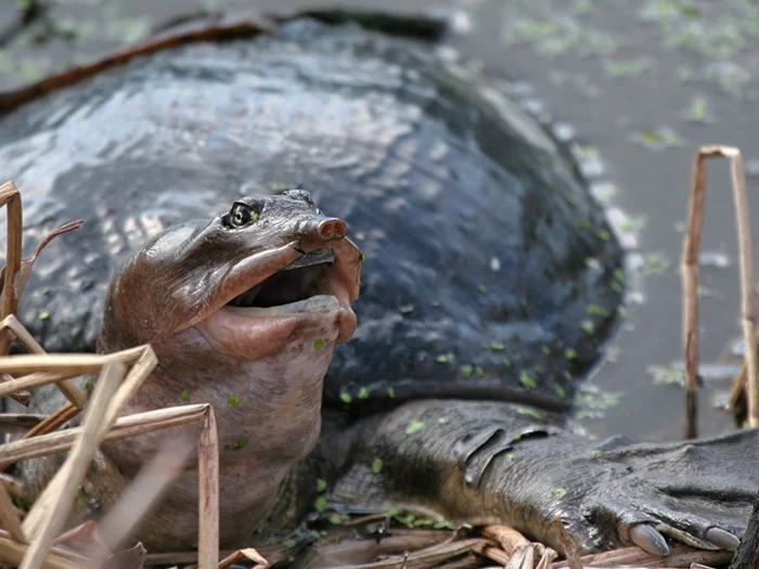 Трионикс способен провести в засаде до 15 часов! В этом ему помогает смешной нос-пипетка и «ротовые жабры». С первым всё понятно: черепах вытягивает голову, дотягивается хоботком до поверхности и дышит, как через трубочку. Вторая особенность интереснее: в глотке триониксов есть специальные выросты слизистой — папиллы. Они работают почти как жабры рыб: поглощают кислород, а выделяют углекислый газ и аммиак. Для того, чтобы «подышать», черепахе нужно просто открыть рот.