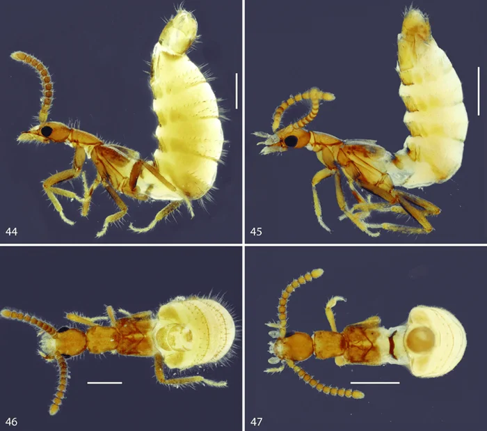 Австроспирахты принадлежат к семейству стафилинид, пожалуй, самому многочисленному семейству жуков. Оно почти целиком состоит из хищников, и хищников неплохих. Но герои этой статьи просто слабаки — 2-3 миллиметра длины, полупрозрачный экзоскелет, микроскопические челюсти. С такими данными охотиться не получится, только побираться. Вот они и пошли по миру.