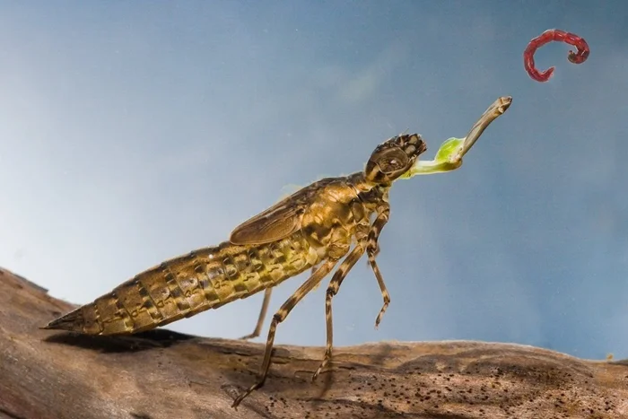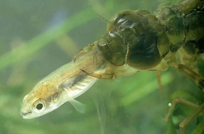 Свою жертву личинка настигает стремительно. В этом ей помогает сразу несколько анатомических приколов. Во-первых, реактивный двигатель прямо на пятой точке. Деточка стрекозы всасывает воду через анальное отверстие и выбрасывает, рывком устремляясь к добыче.