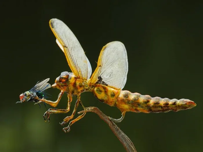 Гладкий прочный экзоскелет — это тоже оружие. Стрекоза попросту таранит других насекомых в воздухе. От мощного удара добыча погибает моментально. А хищница с наслаждением поглощает тело павшего, пожирая его прямо в полёте.