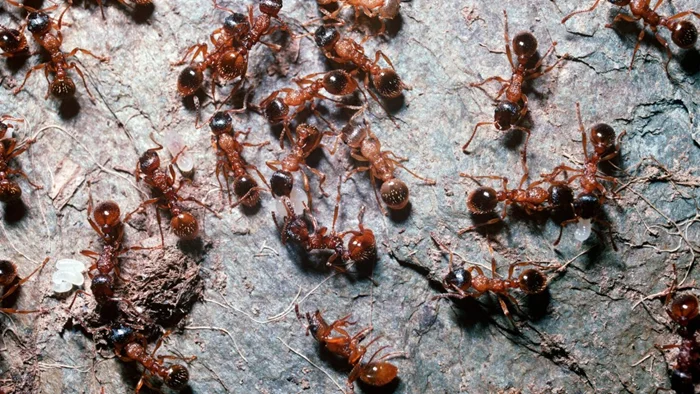 А вот с красными муравьями ситуация сложнее. Красный хитин таскают представители сразу нескольких родов, и живут они очень по-разному. Кроваво-красные муравьи-рабовладельцы, например, полностью оправдывают своё название: нападают на чужие колонии, воруют яйца и личинок, после чего выращивают из них своих рабочих.