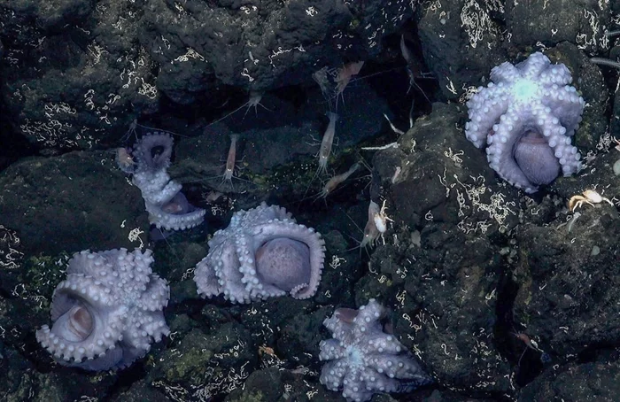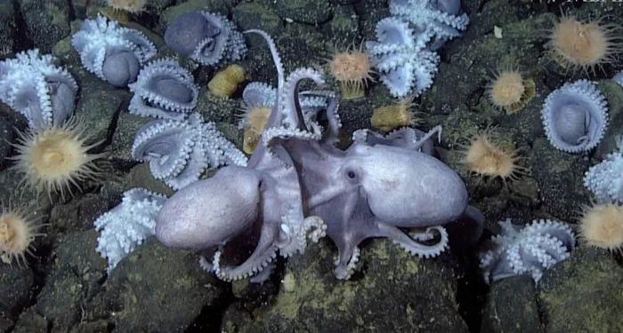 На внезапное собрание моллюсков ученые наткнулись в 2018 году, когда бороздили воды недалеко от Калифорнии. На глубине в 3 км и скромном пяточке в 2,5 гектара плотно закрепились десятки тысяч глубоководных осьминогов. Чтобы раскрыть секрет непонятного шабаша, потребовалось несколько погружений биологов, геологов и инженеров.