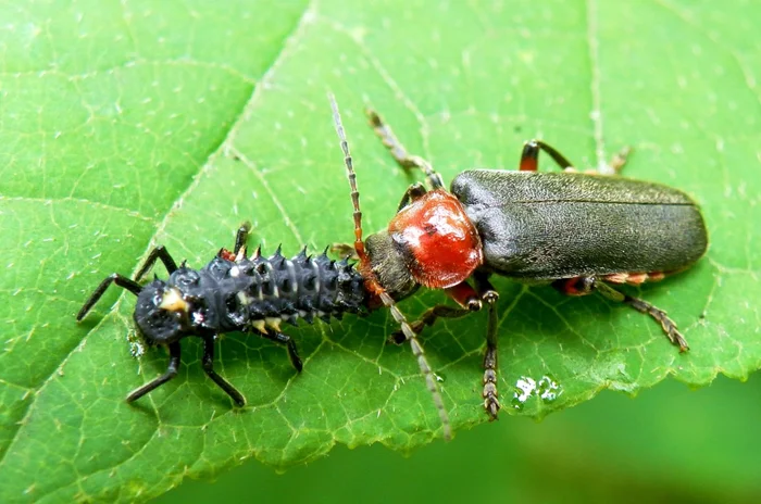 Мягкотелки активно и с удовольствием кушают насекомых-вредителей. Но конкретно этот решил перекусить личинкой божьей коровки, другим крутым энтомофагом.