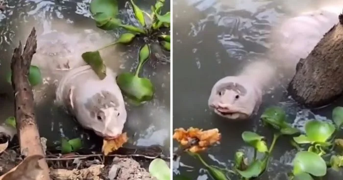Это гигантская речная черепаха, и, вероятно, у неё альбинизм, из-за которого она имеет такой цвет.