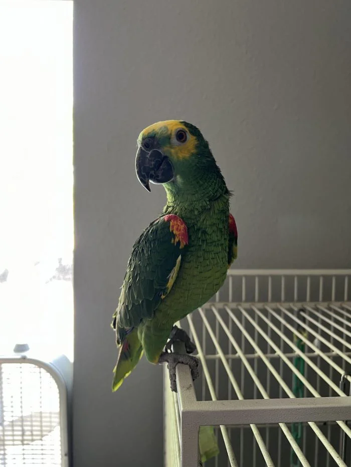 "Недавно я приняла в свою семью 35-летнего синелобого амазона Пэриса. Его прежнему хозяину осталось жить всего несколько месяцев. У меня уже есть жако. Они пока знакомятся на расстоянии!"