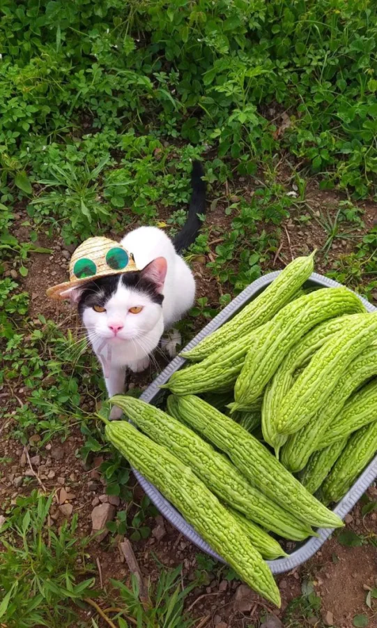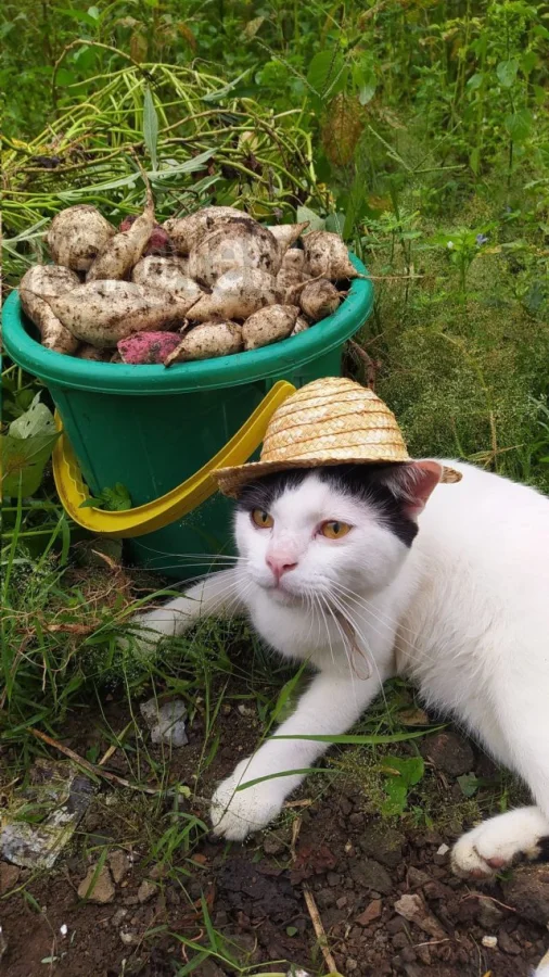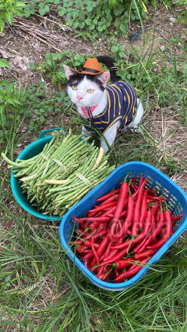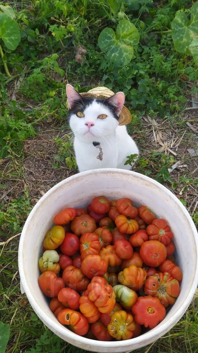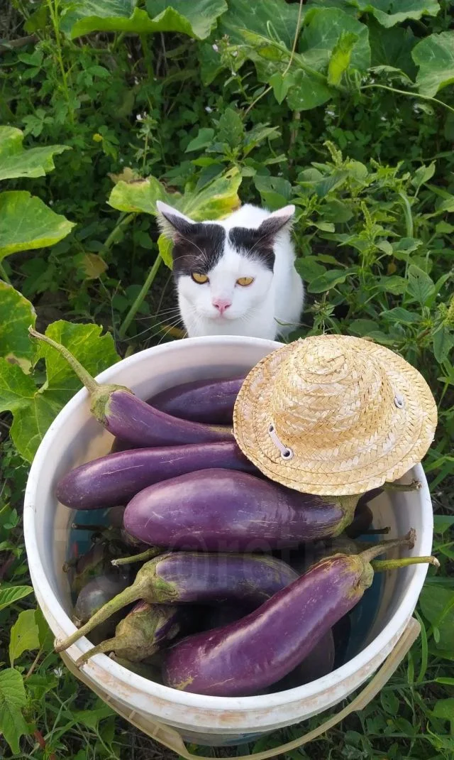 Ну хватит уже обижать котиков и говорить, что от них нынче пользы никакой нет. Вы только поглядите на этого дачника. Котофей трудился целый день и собрал солиднейший урожай! И ни разу не пожаловался на лапки, между прочим. Ну каков же красавец!
