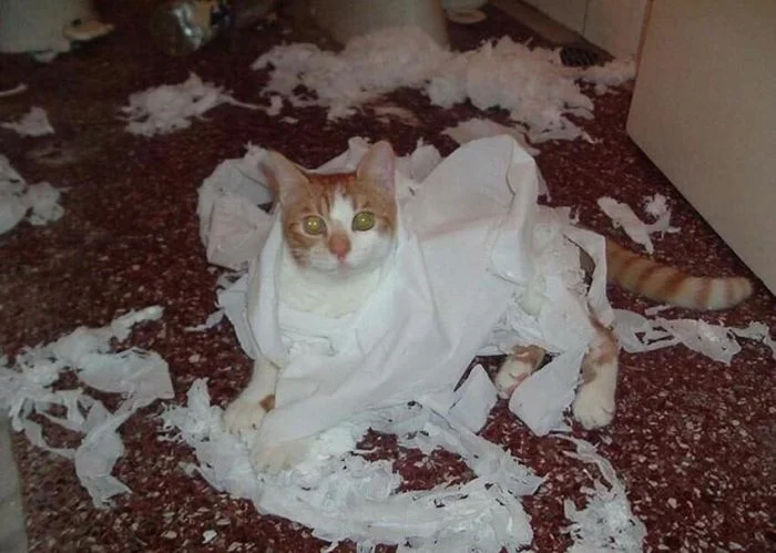 Почему ты фотографируешь вместо того, чтобы помочь? Он был дома один и храбро защищал его, когда на него напали эти жестокие туалетные бумаги!