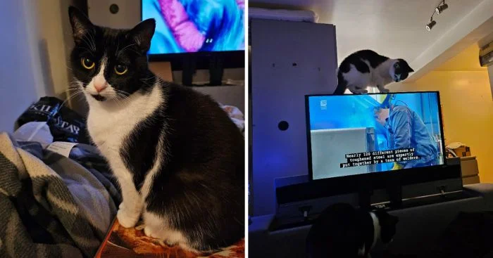 Минерва научилась нажимать кнопку, чтобы выключить телевизор и разбудить меня. А Афина просто забирается на него сверху.
