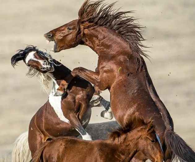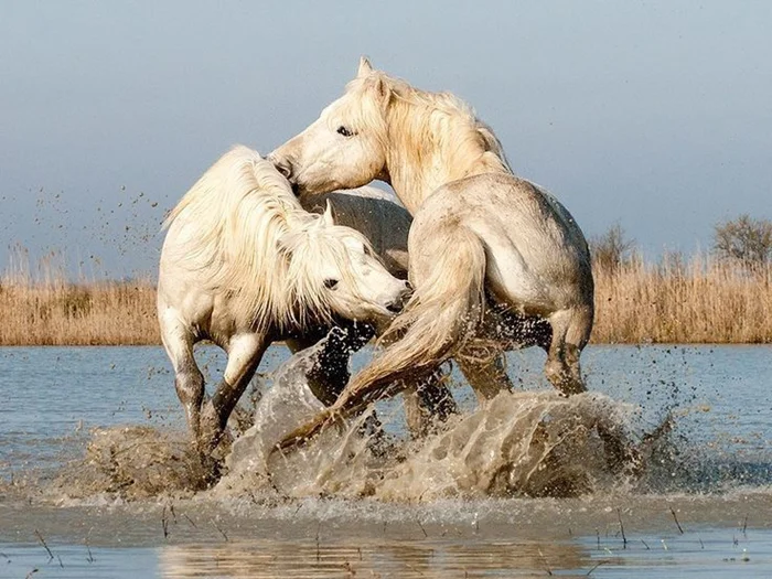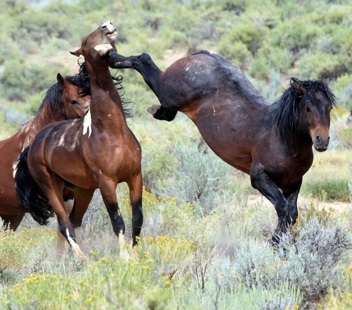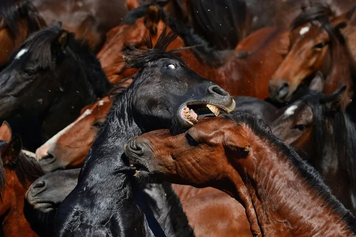 Кажется, что здесь не происходит ничего особенного. Но лошадь слева — в бешенстве. На это указывают её прижатые уши. И кусать она собирается не понарошку.