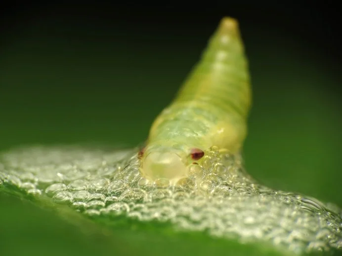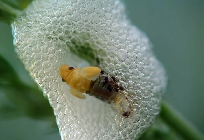 Личинки цикад ещё меньше родителей — 3-5 мм. Но аппетит у растущих организмов нехилый. Малышня рассаживается по стеблям, ищет самый лакомый уголочек. И как только найдёт — вцепится и не отпустит. 50 дней личинка тянет из растения все соки. А вместе с тем выделяет ту самую жижу.