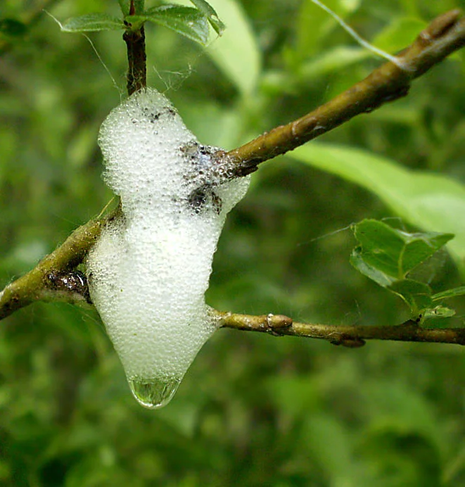 В детстве мы называли её «заячья слюна». Учёные говорят, что плевков субстанция не содержит. Она состоит из муцина. Вообще, эта штука есть даже у нас: муцин — основной компонент в составе секретов всех слизистых желёз. Но пенница взбивает выделения, укутываясь в липкую противную пену. В таком наряде она защищена и от высыхания, и от хищников, и от непогоды, и от — та-дам! — инсектицидов. А за отравой невольно потянется рука, если вы заметите, как цикадка плюёт на ваши садоводческие усилия.