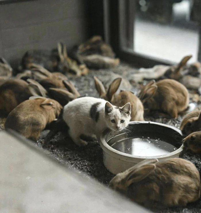 Котенок с друзьями-кроликами в Линне, Массачусетс, около 1930 года.