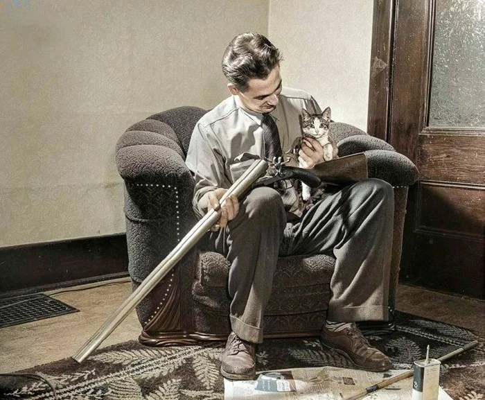 На ней его дочь Паула и котенок одновременно улыбаются на камеру. …хотя кошка не улыбается, а мяукает, 1955 год.