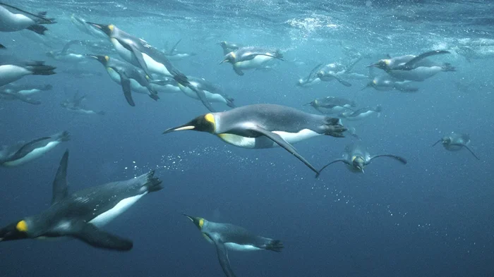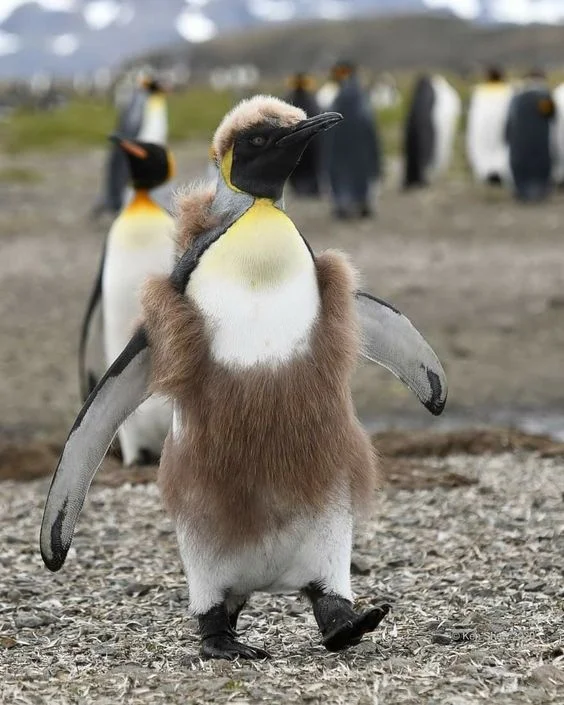 Одно забавно — детство у королевских пингвинов кончается внезапно. В один прекрасный миг с пингвинёнка слезает детская шубка, и вот перед нами полноценный член пингвиньего общества. По размерам от родителей его не отличить. Но до настоящего взросления ещё плыть и плыть.